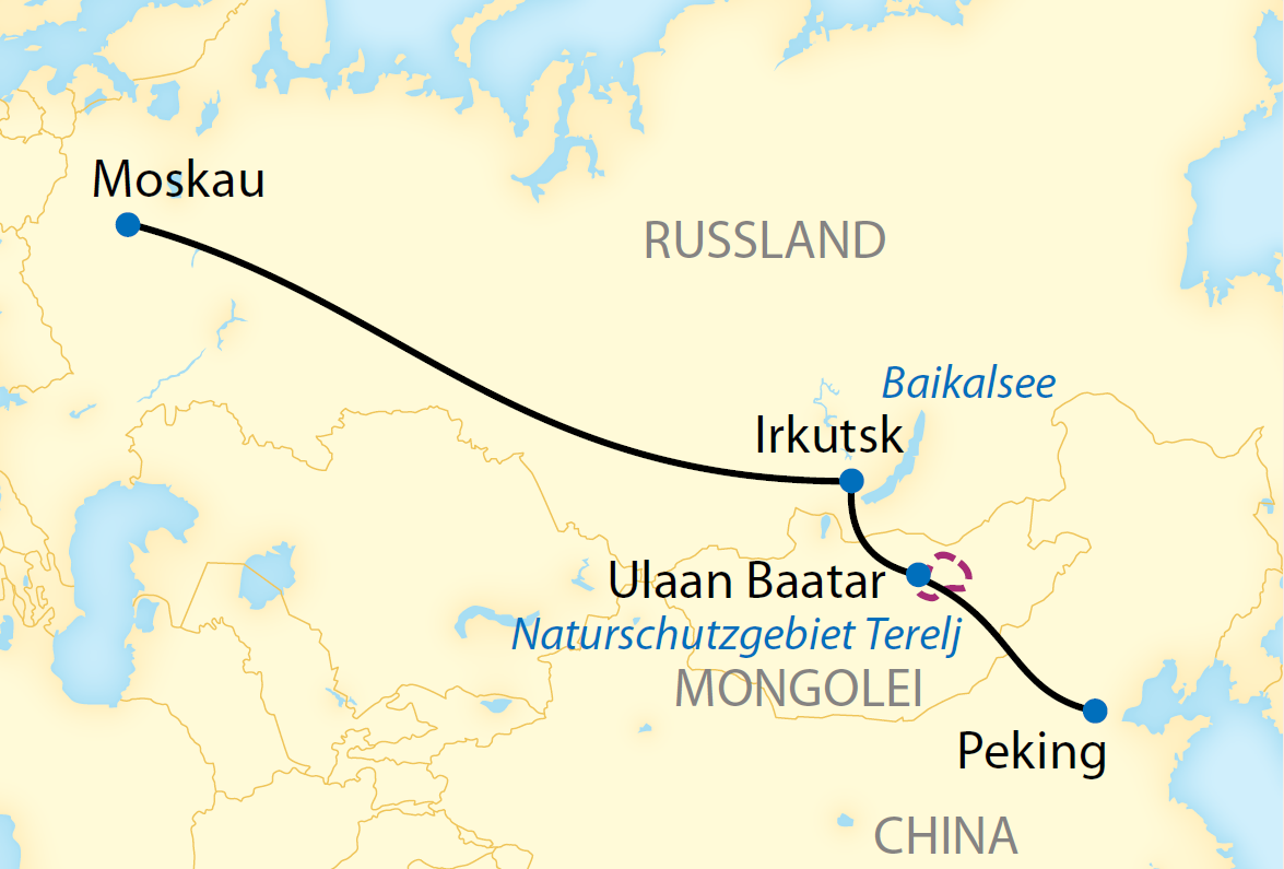 Diese Beispiel-Reise stellt Ihnen eine besonders beliebte Reise-Variante vor, bei der Sie an den bedeutendsten Stationen der Transsib haltmachen. Sie können den Reiseverlauf nach Ihren persönlichen Vorstellungen und individuellen Wünschen verändern, nur die Zugfahrt nach China (hier: 13. Tag) muss auf einen Donnerstag fallen.