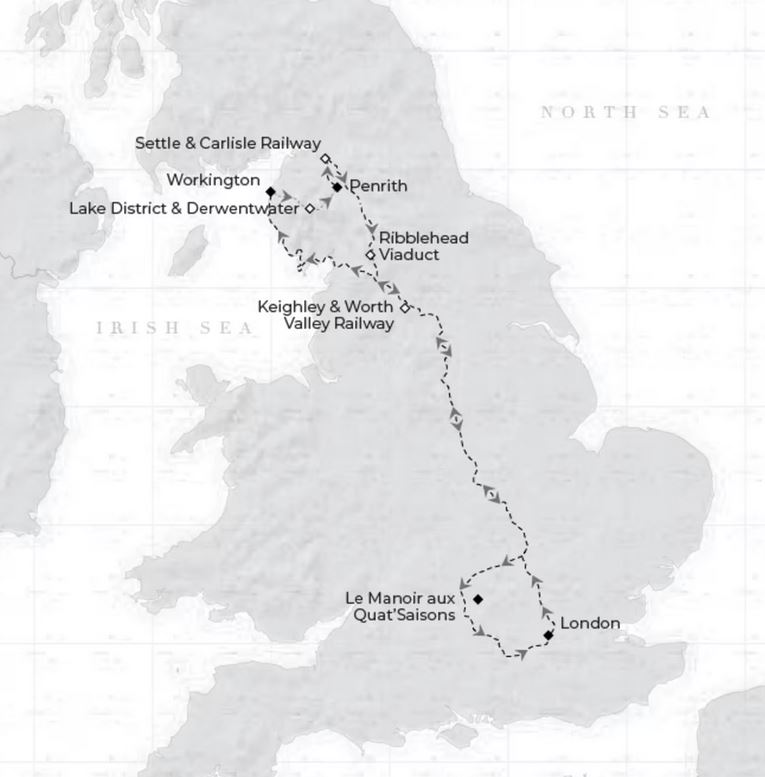 Diese luxuriöse Zugreise verbindet Geschichte und Abenteuer nahtlos, von belebenden Outdoor-Aktivitäten bis hin zur Eleganz prächtiger Landgüter. Den Höhepunkt bildet ein elegantes Galadinner in Oxfordshire im Le Manoir aux Quat'Saisons – eine Feier zeitloser Raffinesse und Michelin-Stern-Kulinarik. Für Literaturbegeisterte ist diese Region seit langem eine Inspirationsquelle, die Shakespeare, Beatrix Potter und Wordsworth durch ihre Schönheit und Tiefe bewegt hat.