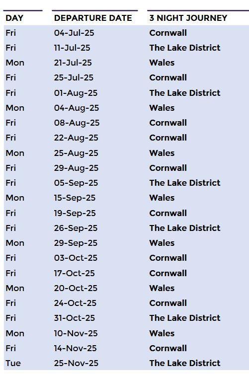 Hinweis: Diese Reise startet am Freitagnachmittag und endet am Montagmorgen. Unser Zug unterliegt den Einschränkungen des nationalen Bahnnetzes, und die angegebenen Zeiten sind rein indikativ; bitte überprüfen Sie Ihre endgültige Reiseroute für die bestätigten Abfahrtszeiten.