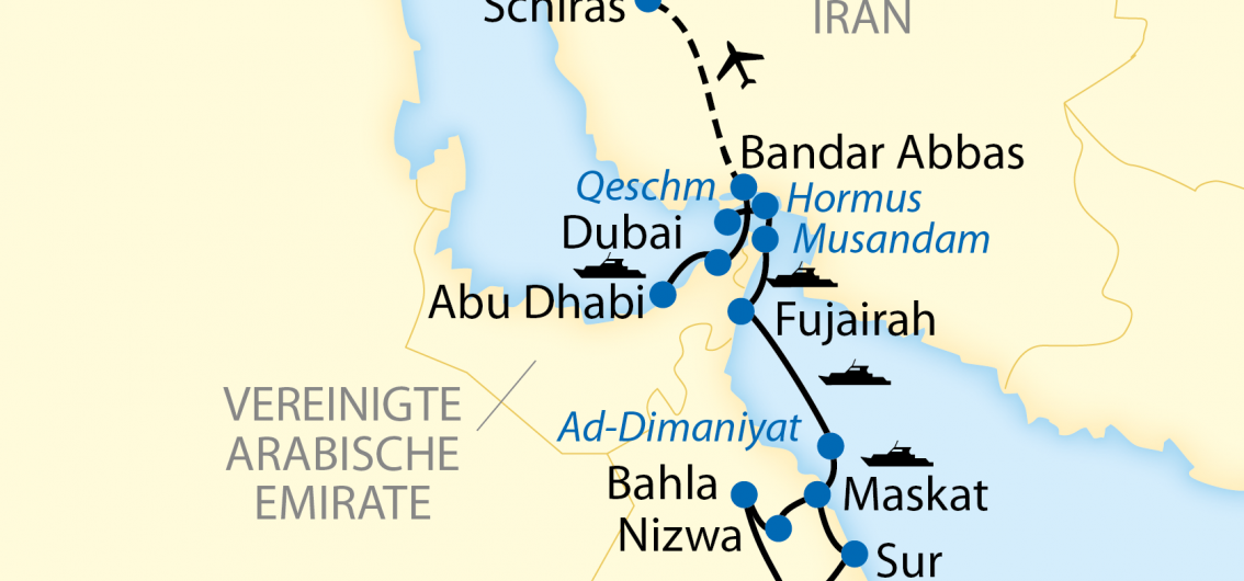 Willkommen in den Vereinigten Arabischen Emiraten! Entlang der palmengesäumten Ostküste des kleinen Emirats Fujairah gelangen Sie zur Oase Bitna, die von einer gewaltigen Festung bewacht wird. Unweit befindet sich die Bidiya-Moschee, das älteste Gotteshaus der Emirate, das komplett aus Lehm besteht. Beim Besuch einer arabischen Familie speisen Sie herrlich lokal und authentisch. Bei dieser Gelegenheit können Sie von der Hausherrin und ihrer Familie erfahren, wie sich Tradition und Moderne im Übermorgenland vertragen. Nach einer kleinen Stadtrundfahrt entlang der Corniche stechen Sie abends wieder in See. Von Fujairah aus ist es nur ein Katzensprung bis zum Persischen Golf. Am gegenüberliegenden Ufer erwartet Sie der Zauber des alten Persiens. (FMA)