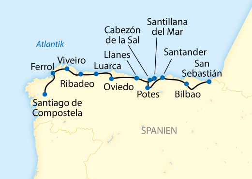 Besichtigung des Altamira de Neocueva-Museums mit seiner Reproduktion der Höhlenmalerei des Jungpaläolithikums. Anschliessend Besuch von Santillana del Mar mit seinem vorzüglich erhaltenen mittelalterlichen Stadtkern. Nach dem Mittagessen Zugfahrt nach Santander. Stadtbesichtigung und Freizeit. Nach dem Abendessen können Sie das Gran Casino de Santander in eigener Regie besuchen. Übernachtung im Hotelzug in Santander. (FMA)
