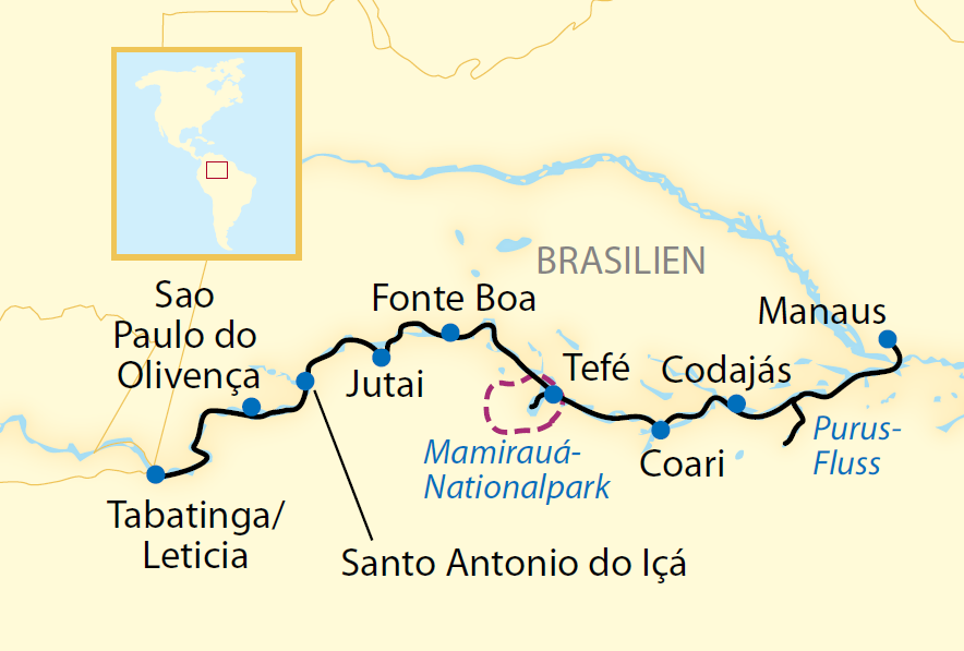 Die Stadt Fonte Boa ist der nördlichste Punkt Ihrer Reise und lediglich etwa 200 km vom Äquator entfernt. Nach dem Frühstück machen Sie sich auf zu einer Exkursion durch einen der schmalen Seitenarme, wo die Ufer auf beiden Seiten zum Greifen nah sind. Hier leben die Bewohner am Ufer vom Fang des Pirarucú-Fisches, der bis zu 2 m lang und 150 kg schwer werden kann. Dieser Fisch ist äusserst schmackhaft und wird in zahllose Länder exportiert. Nachmittags informiert Sie an Bord ein spannender Vortrag über den Umwelt- und Naturschutz in Brasilien, bevor Sie ein Bootsausflug im Regenwald erwartet. (FMA)
