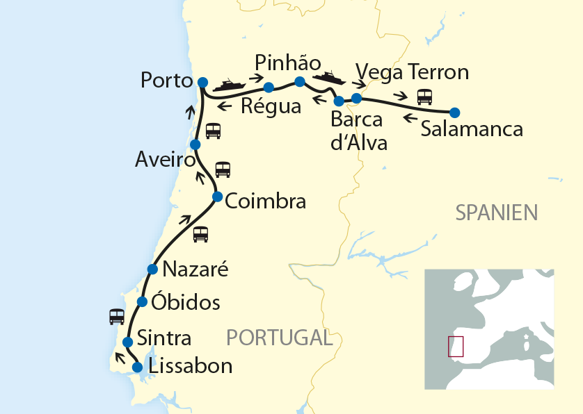 Zur schönsten Reisezeit erleben Sie auf einer zauberhaften Route durch Portugal zahlreiche Höhepunkte wie die romantische Hauptstadt Lissabon, die UNESCO-Welterbe-Stätten in Belém und Sintra mit ihren imposanten Klöstern und Palästen, die nostalgische Kulturmetropole Porto und als krönenden Abschluss eine 8-tägige Flusskreuzfahrt im überwältigend schönen Douro-Tal (UNESCO-Weltnaturerbe). Die exklusiv für Sie gecharterte Spirit of Chartwell bietet Ihnen den grossen Vorteil, in einer kleinen Gruppe mit höchstens 27 Mitreisenden an Bord zu sein. Wo ansonsten nur grosse und unpersönliche Kreuzfahrtschiffe verkehren, sind Ihnen auf der Spirit of Chartwell Komfort und gleichwohl eine besonders private Atmosphäre sicher!