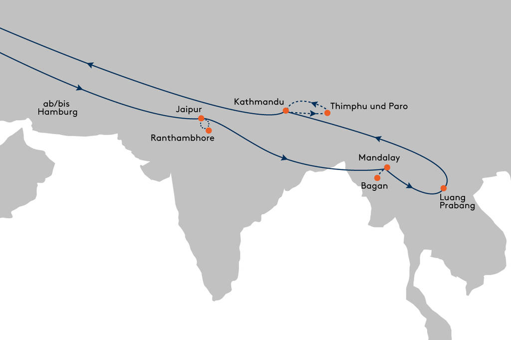 Vom Reich des Bengalischen Tigers zu den Tempeln von Myanmar, von den Ufern des Mekong bis zu den Gipfeln des Himalaya: Wenn Ihr Privatjet ALBERT BALLIN Kurs auf uralte Kulturschätze und versteckte Naturwunder nimmt, kommen Sie den Geheimnissen Asiens zum Greifen nah.