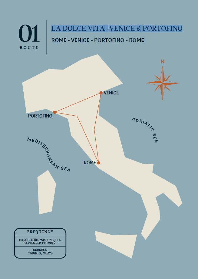 Eine legendäre Reise, um die Wunder und Geheimnisse Venedigs zu entdecken. Danach folgt die Erkundung von Portofino, einem charmanten Dorf an der italienischen Riviera, bevor es zurück nach Rom, der Ewigen Stadt, geht.