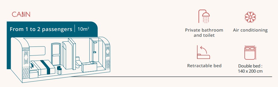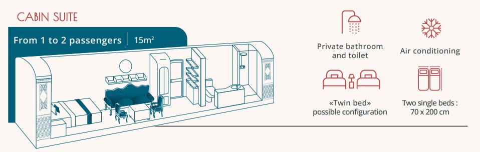 Die Kabinen verfügen über private Badezimmer mit Dusche und Toilette, anpassbaren Komfort, und es steht ein Butler-Service zur Verfügung.