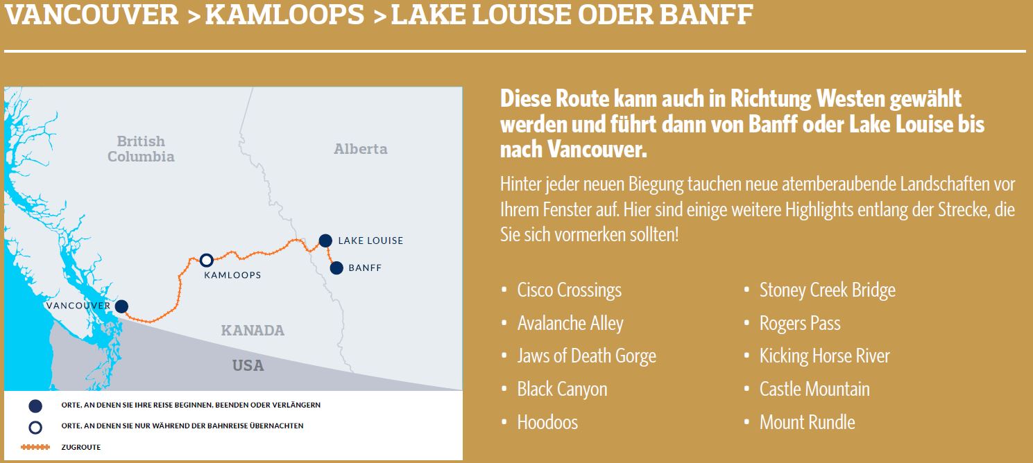 Steigen Sie in den Rocky Mountaineer mitten in der urbanen Oase Vancouver (British Columbia) ein und starten Sie Ihre Fahrt durch die grünen Felder und Wiesen des Fraser Valley. Das Landschaftsbild wechselt von üppigen fruchtbaren Landflächen in steil aufragende Gipfel der Coast Mountains. Sie kommen am mächtigen Strom des Fraser River vorbei und bestaunen die herabrauschenden Wassermassen am Hell’s Gate. Erneut ändert sich die Szenerie, und Sie finden sich plötzlich inmitten von Buschland und Wüste wieder. Der Zug fährt in die Stadt Kamloops ein, und Sie übernachten im Hotel.
