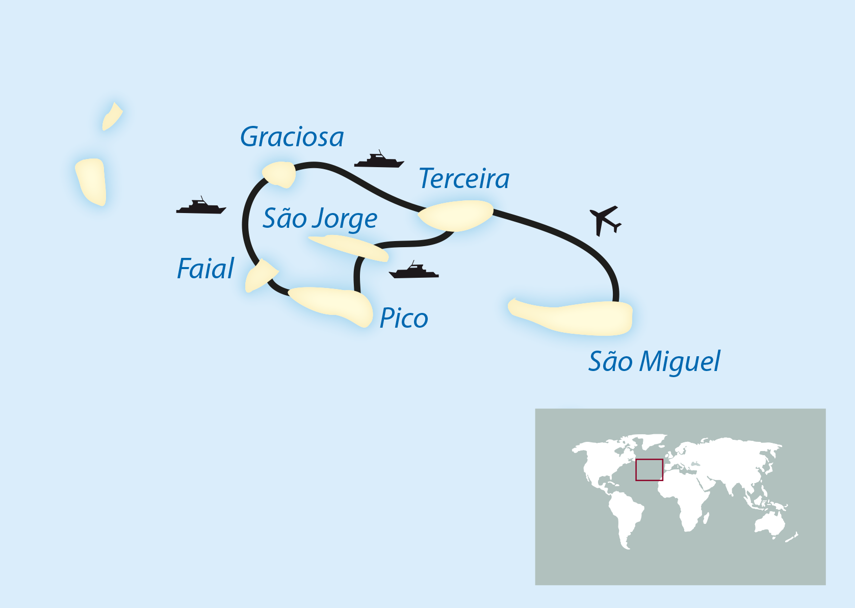 Nur einen Katzensprung ist es von Pico zur Nachbar- Insel Faial. Unzählige blaue Hortensien gaben ihr den Beinamen Ilha Azul – Blaue Insel. Vom 1.000 m hohen Kraterrand überblicken Sie die gesamte Insel. Aktiven Vulkanismus erleben Sie am Vulcão dos Capelinhos, der 1957/58 ausbrach und den Leuchtturm in einer bizzaren Mondlandschaft versenkte. Lebendiger ist der Hauptort Horta mit seinem quirlig-bunten Yacht-Hafen, in dem Segler aus aller Welt nach erfolgreicher Atlantik-Passage ankern. Im legendären Peter Café Sport geniessen Sie das internationale Flair. (FMA)