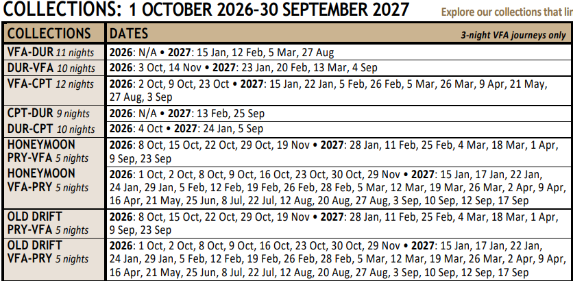 Jede Rovos Collection bietet eine massgeschneiderte Kombination aus erstklassigen Zugreisen, wie der berühmten Strecke zwischen Kapstadt, Durban oder den Victoriafällen, und luxuriösen Unterkünften in renommierten Hotels, charmanten Boutique-Gästehäusern oder exklusiven Safari-Lodges. Die Reiserouten beinhalten auch spannende Ausflüge und Abenteuer, sei es eine unvergessliche Flusskreuzfahrt auf der Zambezi Queen, eine Safari im Madikwe-Wildreservat oder ein Aufenthalt in der legendären Old Drift Lodge in Simbabwe.