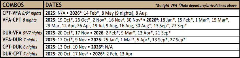 The 3-night Cape Town before/after the 9-night Golf Safari or 11-night Namibia Safari; the 11-night Namibia Safari (WVB-PRY) with the 3/4-night Victoria Falls trip (PRY-VFA); the 11-night Namibia Safari (WVB-PRY) with the 12-night African Collage (PRY-CPT)…