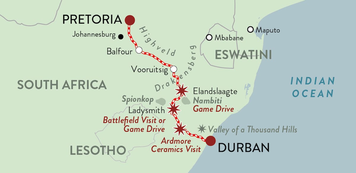 Diese Safari zwischen Pretoria und Durban findet in den Sommermonaten statt und umfasst Wildbeobachtungsfahrten, eine Schlachtfeldgeschichte von einem erstklassigen Historiker und einen Einblick in ungewöhnliche afrikanische Keramiken. Erleben Sie das Nambiti Conservancy – ein privates Big Five-Reservat auf 20.000 Hektar malariafreiem Buschland in KwaZulu-Natal. Es bietet eine unglaubliche Artenvielfalt, darunter Savanne, Grasland, Dornbusch und hohe Akazienbäume. Die Spionkop Lodge, die an ein 11.000 Hektar grosses Naturschutzgebiet grenzt, ist die perfekte Basis, um die Berge, das Buschland, die Vogelwelt und die historischen Schlachtfelder der Region zu erkunden. Ardmore Ceramics erzählt die Geschichte der Zulu, deren Sinn für Rhythmus, Farben, Tanz und Gesang sowie der Geist der afrikanischen Vorstellungskraft die Kontinente der Welt beeinflusst. Besuchen Sie dieses charmante Zentrum in den Midlands von KwaZulu-Natal, bevor Sie durch das Tal der Tausend Hügel nach Durban reisen.