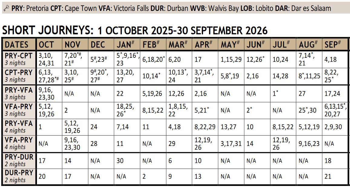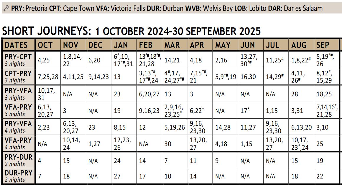 PRY-CPT: D:10.00 A:10.00/#15:00 ◆ CPT-PRY: D:16.00 A:10.00/#D:09.30 A:15.00 ◆ PRY-VFA 3 nights: D:10.00 A:10.00 ◆ VFA-PRY 3 nights: D:17.00 A:10.00 ◆ PRY-VFA 4 nights: