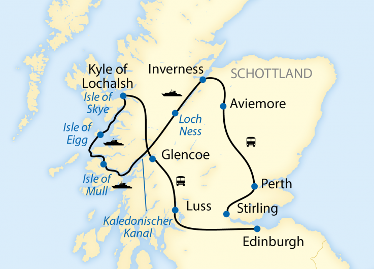 Wandeln Sie auf den Spuren von Königen und Rebellen – auf dieser aussergewöhnlichen Schottland-Reise, die Sie von Stirling Castle über den ursprünglichen Sitz des Stone of Scone (Krönungsstein) bis zum Schlachtfeld von Culloden führt. Auf der anschliessenden Kreuzfahrt mit der MV Lord of the Highlands durchfahren Sie den legendären Loch Ness und den Kaledonischen Kanal, erleben die Highlands in ihrer ganzen Schönheit, bevor Sie das Festland verlassen und zwischen den Inseln der Inneren Hebriden Seeluft schnuppern. Mit zwei Übernachtungen in Edinburgh beschliessen Sie Ihre Reise in der Hauptstadt Schottlands, wo Sie im Schatten der Burg von Edinburgh die spektakulärste Militärparade der Welt erleben.