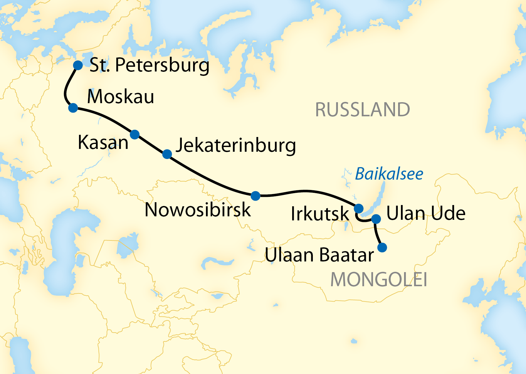 Unsere kulturreiche Zwei-Länder-Route: St. Petersburg, Moskau, Kasan, Jekaterinburg, Nowosibirsk, Irkutsk, Baikalsee, Ulaan Baatar.