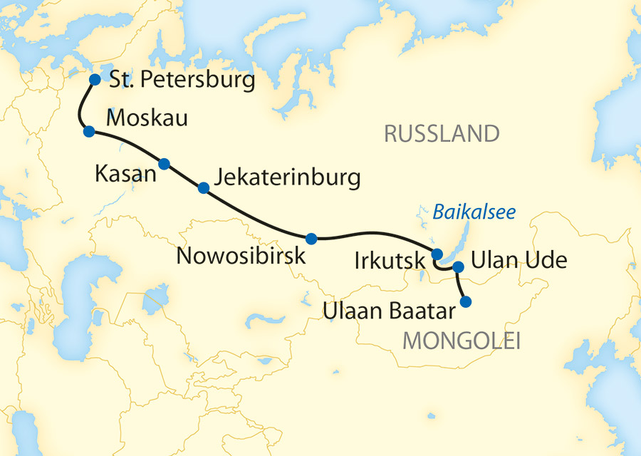 Unsere kulturreiche Zwei-Länder-Route: Ulaan Baatar, Baikalsee, Irkutsk, Nowosibirsk, Jekaterinburg, Kasan, Moskau, St. Petersburg. Auf dieser neuen Reiseroute starten Sie inmitten einer der ausgedehntesten ländlichen Idyllen, die man sich vorstellen kann: in den unendlichen Weiten der Mongolei, wo Sie in einer echten Jurte übernachten – unter freiem Sternenhimmel, ganz wie die Nomaden. Dann rollt Ihr Sonderzug nach Russland, wo Sie tief in die unterschiedlichen Kulturen der drei bedeutendsten russischen Städte eintauchen: Am Anfang steht die ostsibirische Hauptstadt Irkutsk mit ihren reich verzierten Holzhäusern und der Nähe zum Baikalsee, nach der Überquerung des Urals übernachten Sie in der mittlerweile hypermodernen Metropole Moskau und ganz zum Schluss erkunden Sie die in historische Gewänder gekleidete Zarenstadt St. Petersburg.