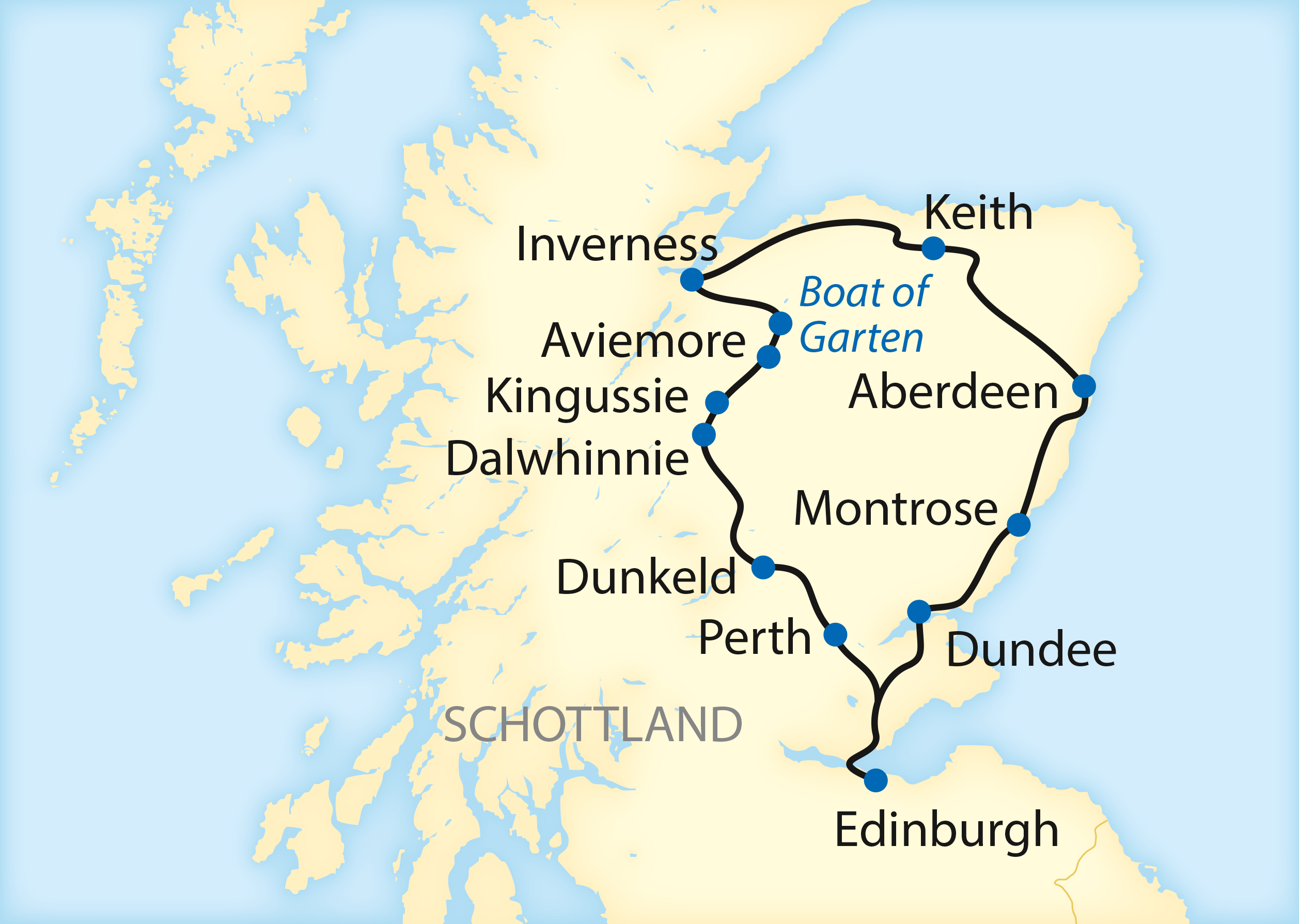 Machen Sie es sich an Bord des Zuges gemütlich, während er durch das ehemalige Königreich Fife in Richtung Norden rollt und Sie langsam in die dramatischen Landschaften der Highlands eintauchen. Am Abend geniessen Sie ein gemeinsames Abendessen und Unterhaltung im Aussichtswagen. Nachts Halt im Dorf Boat of Garten. (A)