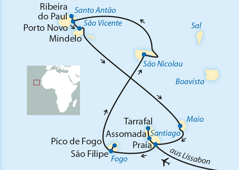 Archipel am Schnittpunkt dreier Kontinente, von Seefahrernationen geprägt und lange von der Welt vergessen. Eine Prise Afrika, ein Hauch von Brasilien und ein Quäntchen Portugal – das sind die Zutaten für die einzigartige Mischung von Natur und Kultur auf den Kapverden. Farbenfrohe Dörfer, schroffe grüne Bergriesen, spektakuläre Vulkane, endlose goldene Sandstrände und melancholische Klänge – nie war das Ende der Welt schöner! Und wie lassen sich die Kapverdischen Inseln besser entdecken als an Bord eines kleinen Schiffes mit nur 25 Kabinen, das überall vor Anker gehen kann? So erleben Sie die ganze Vielfalt des Archipels ohne aufreibende und teure Inlandsflüge von Insel zu Insel. Boa viagem!