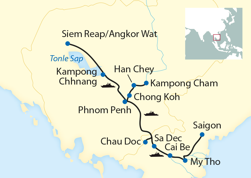 Vormittags haben Sie Gelegenheit, Tan Chau zu erkunden, einen charmanten Ort nahe der kambodschanischen Grenze mit schwimmendem Markt, alten Tempeln und einer Fischfarm. Am Nachmittag reisen Sie in Richtung Kambodscha. Während die Crew für Sie die Einreiseformalitäten erledigt, geniessen Sie die Annehmlichkeiten an Bord. Anschliessend geht es weiter nach Phnom Penh, wo Sie an der Uferpromenade einen ersten Spaziergang unternehmen können. (FMA)