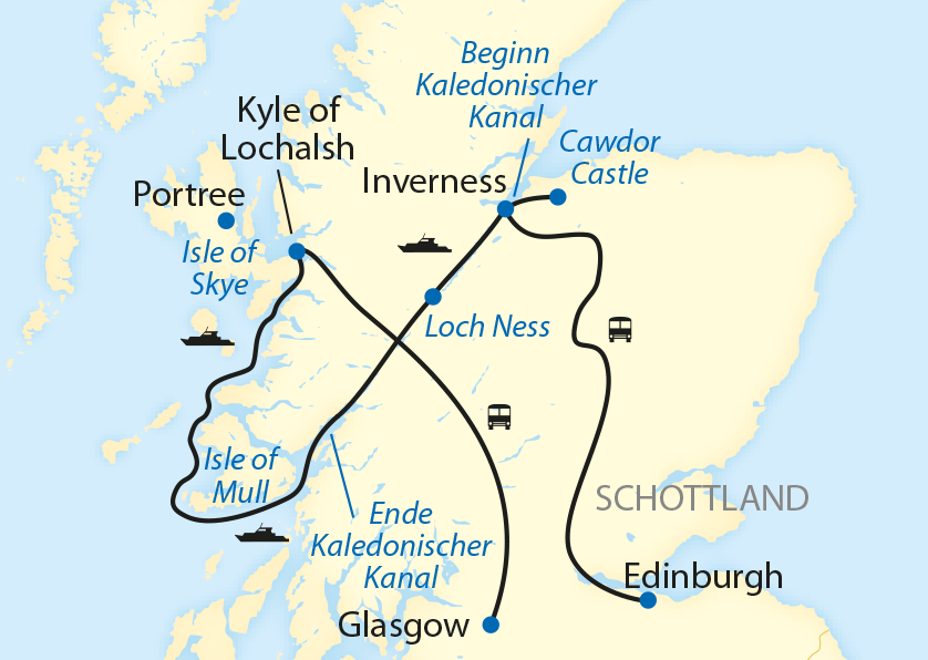 Nach dem Frühstück fahren Sie per Bus durch die romantischen Highlands nach Inverness an die Ostküste Schottlands. Zwei der berühmtesten Burgen Schottlands besuchen Sie auf dem Weg dorthin. Das repräsentative, weiss verputzte, zinnen- und zimmerreiche Schloss Blair Castle, einst Sitz des Herzogs von Atholl, ist ein wahrer Publikumsmagnet. Sie werden schnell verstehen, warum das so ist. Den Schauplatz des Todes von Duncan aus William Shakespeares Tragödie Macbeth sehen Sie während Ihrer Besichtigung von Cawdor Castle. Auch weniger literaturbegeisterte Gäste werden sich an der wertvollen Inneneinrichtung und der prächtigen Gartenanlage erfreuen. Am späten Nachmittag treffen Sie im Küstenort Inverness ein und beziehen Ihre Kabine auf der MV Lord of the Glens, Ihrem schwimmenden Zuhause für die nächsten 7 Tage. Regionale Spezialitäten geniessen Sie beim Begrüssungs- Dinner an Bord. (FMA)