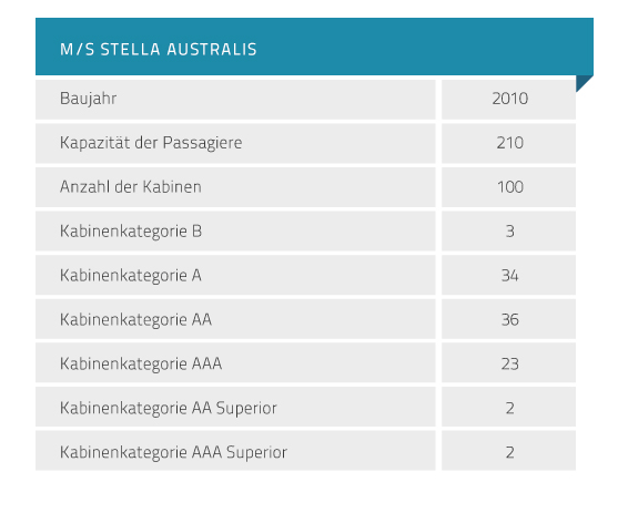 Egal ob Sie nach Patagonien gereist sind, um ihre unberührten Attraktionen zu erkunden oder ob Sie sich lieber eine hervorragende Haute Cuisine fürstlich schmecken lassen wollen, auf der Stella Australis werden all Ihre Träume wahr. Das Luxuskreuzschiff bietet Ihnen eine geräumige Kabine mit Nobelbetten, Verstaumöglichkeiten und einem Lounge-Bereich. Zusätzlich zu den Raumeinrichtungen können die Passagiere den Blick auf den rauhen Ozean und die schneeweissen Gipfel der Bergkette bewundern. Für Persönlichkeiten des öffentlichen Lebens ist unsere luxuriöse Skylounge massgeschneidert, da sie ihnen die ideale Atmosphäre bietet, Gäste aus der ganzen Welt zu treffen und gleichzeitig unsere üppigen Getränke- und Mahlzeiten-Specials zu geniessen. Erleben Sie die unglaubliche Schönheit, die Ihnen Patagonien bietet, unterwegs auf unseren Kreuzfahrtschiffen zu Orten wie Kap Hoorn , Feuerland und vieles mehr.