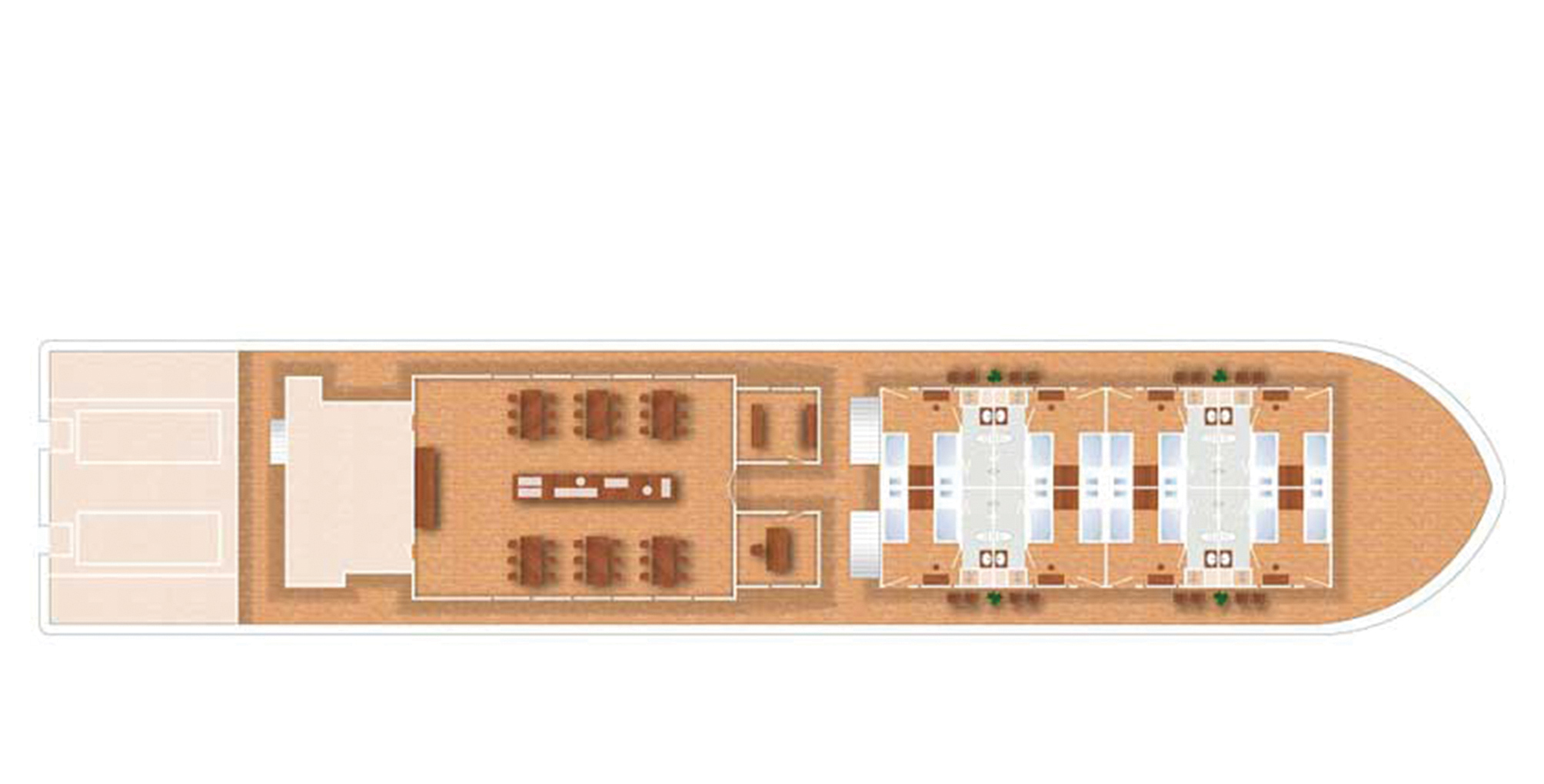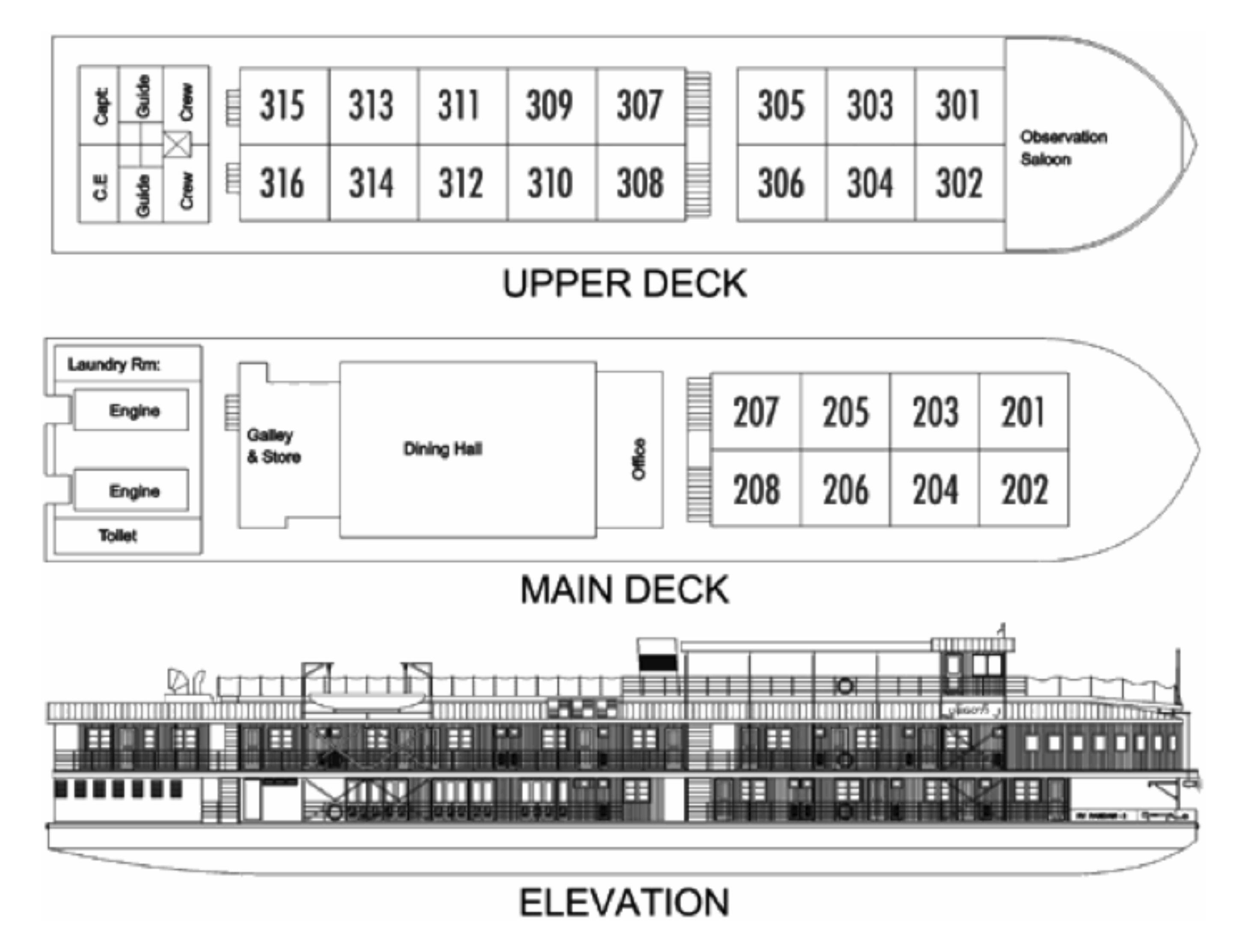 Pandaw II remains the stately queen of our fleet, if not the river. This is the one ship that has not been fully refitted, partly because the crew have treated her with such love and care that she does not need a refit and partly because she is something of a cult ship with a considerable following and we want to preserve the original Pandaw cabin with their real ship’s berths and the old door and window arrangement rather than the French windows of our other P class ships. We have though bowed to demand and have created two splendid suites out of four old cabins that run across the forward upper deck.