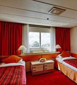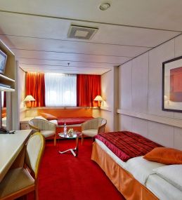Beschreibung: Die Aussenkabinen der Kategorie D auf deck 6 wurden 2016 renoviert. Sie sind mit einem Doppelbett oder zwei Einzelbetten sowie einem Bad mit Dusche/WC ausgestattet. Zudem befindet sich ein Fernseher sowie ein Kühlschrank in der ca. 17 - 19 m² großen Kabine. Ein Schrank, Klimaanlage, Föhn, DVD-Player und Satellitentelefon gehören ebenso zur Ausstattung. Durch die Panoramafenster genießen Gäste dieser Kabinenkategorie uneingeschränkte Sicht nach draußen.