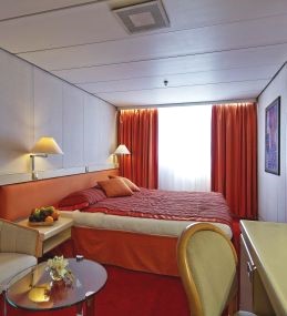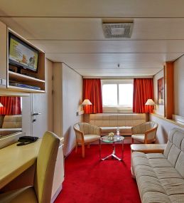 Beschreibung: Die Balkon-Suiten sind ca. 30 m² groß und verfügen jeweils über ein Doppelbett oder zwei Einzelbetten sowie ein Bad mit Dusche und WC. Im Wohnbereich befindet sich eine Sitzecke sowie ein Fernseher. Um das Gepäck zu verstauen, steht ein Schrank zur Verfügung. Weitere Annehmlichkeiten der Balkon-Suiten sind ein Kühlschrank, eine Klimaanlage, ein DVD-Player sowie ein Satellitentelefon. Bodenhohe Fenster eröffnen den Blick auf den großzügigen Balkon, auf dem Sie hochwertige Sitzgelegenheiten zum Entspannen vorfinden. Alle Balkon-Suiten wurden 2015 renoviert.