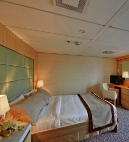 Beschreibung: Die Aussenkabinen der Kategorie O sind mit einem Doppelbett oder zwei Einzelbetten sowie einem Bad mit Dusche/WC ausgestattet. Zudem befindet sich ein Fernseher sowie ein Kühlschrank in der ca. 19 m² großen Kabine. Ein Schrank, Klimaanlage, Föhn, DVD-Player und Satellitentelefon sind ebenfalls vorhanden. Durch Rettungsboote ist die Sicht nach draußen durch die Panoramafenster eingeschränkt.