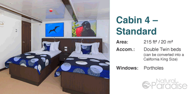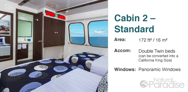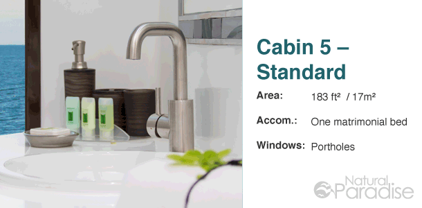 Alle Räumlichkeiten zeichnen sich aus durch komfortable Betten, Safes, Klimaanlagen, private Badezimmer mit warmem Wasser, sowie genügend Platz für Ihre persönlichen Gegenstände. Die 10 Besatzungsmitglieder der Natural Paradise achten stets aufmerksam auf die Bedürfnisse ihrer Gäste. Ein offizieller, zweisprachiger, naturkundiger Reiseführer wird sie bei Ihren Erkundungen anleiten.