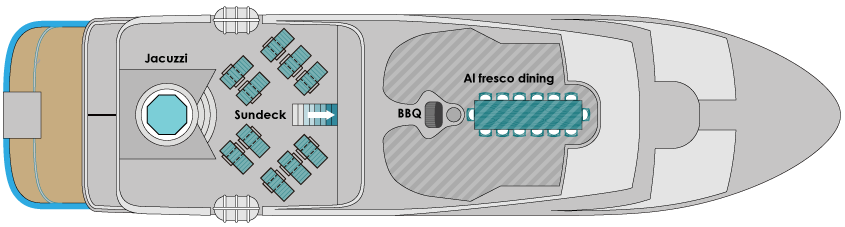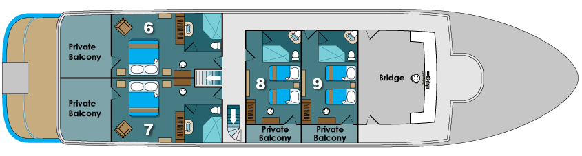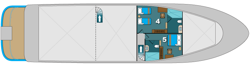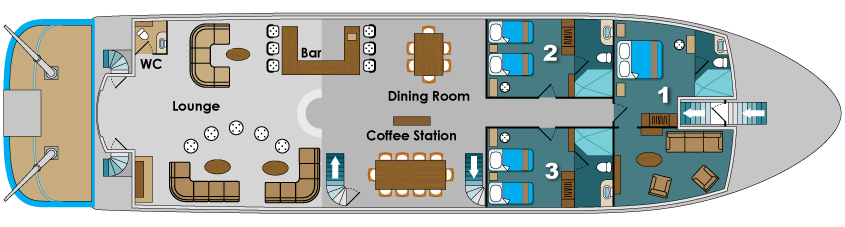 Wenn Sie eine der 4 Doppelbett-Kabinen des oberen Decks bewohnen, werden Sie in den Genuss eines privaten Balkons kommen, von welchem aus Sie nachts die Reflektion des Mondlichts auf den Wellen beobachten können. Weitere Doppel-Kabinen befinden sich auf dem Hauptdeck sowie auf dem unteren Deck. Das Hauptdeck beherbergt zudem eine hervorragend ausgestattete Suite.