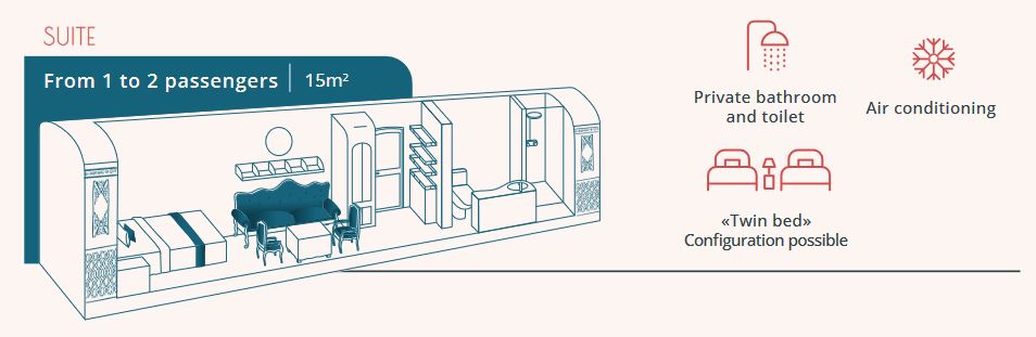 Tagsüber sind sie private Salons, nachts werden sie zu Schlafzimmern mit unvergleichlichem Komfort, die sich ganz nach Ihren Wünschen verwandeln. Die geräumigen Kabinen können auf verschiedene Weise eingerichtet werden, um Ihnen eine perfekte Nachtruhe zu garantieren.