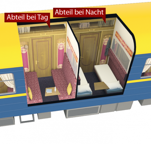 Die Abteile mit dem klangvollen Namen Bolschoi sind 5,57 m² groß und verfügen über zwei Betten, das obere davon 80 cm x 174 cm und das untere 110 cm x 184 cm groß. Weiterhin bietet das Abteil eine gemütliche Sitzgelegenheit, einen großzügigen Tisch und einen kleinen Kleiderschrank. Jedes Abteil hat ein eigenes Bad, das mit Toilette, Waschbecken und integrierter Dusche mit Rundum-Duschvorhang ausgestattet ist. Im Abteil liegen Bademantel und Slipper für Sie bereit. Jeder Zugwagen dieser Kategorie beherbergt gerade einmal sechs Abteile. Als Gast dieser Kategorie werden Sie in Gruppen von maximal 12 Reisen den von einem eigenen Reiseleiter betreut.